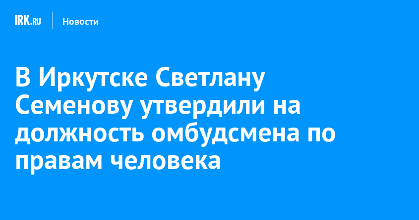 На сессии Законодательного собрания Иркутской области утвердили кандидатуру Светланы Семеновой на должность уполномоченного по правам человека в регионе. Это произошло во второй раз, она занимает должность с 2020 года, сообщил в своем телеграм-канале губернатор Приангарья Игорь Кобзев.