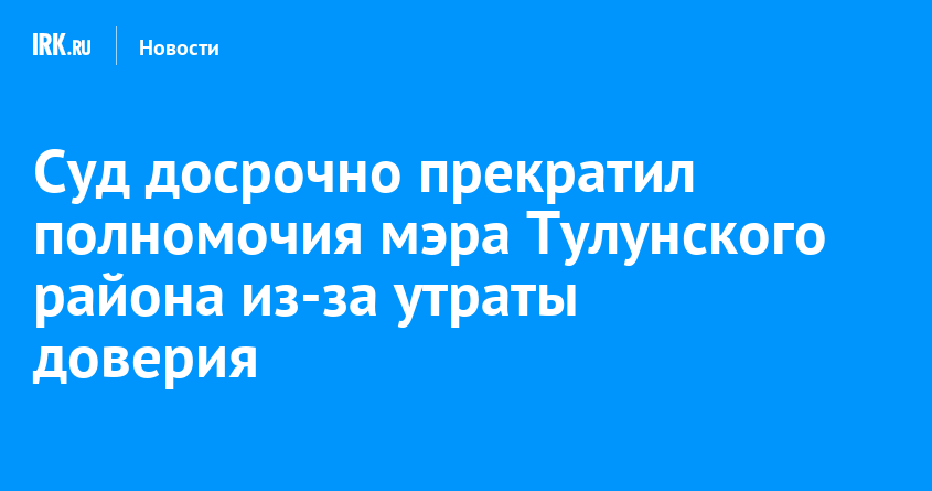 Иркутский областной суд удовлетворил требование прокуратуры о досрочном прекращении полномочий мэра Тулунского муниципального района из-за утраты доверия. Как сообщил журналисту IRK.ru источник, знакомый с ситуацией, речь идет об Александре Тюкове.