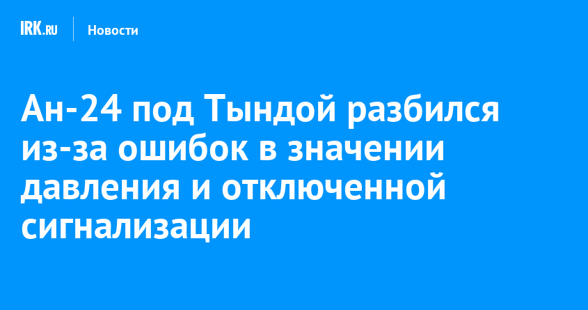Межгосударственный авиационный комитет опубликовал окончательный отчет по результатам расследования крушения самолета Ан-24 авиакомпании «Ангара» под Тындой. Специалисты пришли к выводу, что исправное воздушное судно столкнулось с землей из-за того, что экипаж ошибочно определил высоту полета, а наземные службы не смогли вовремя заметить отклонение, написано в отчете МАК.