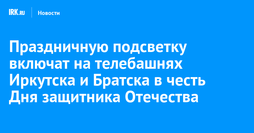 23 февраля с 19:00 до 22:00 на телебашнях в Иркутске и Братске включат архитектурно-художественную подсветку в честь Дня защитника Отечества. Объекты окрасятся в цвета российского триколора. На медиафасаде бегущей строкой отобразится надпись «23 февраля-День защитника Отечества». На фоне камуфляжа появятся изображения флагов родов Вооруженных сил РФ. Затем башни украсит праздничный салют, сообщили в пресс-службе филиала РТРС «Иркутский ОРТПЦ».