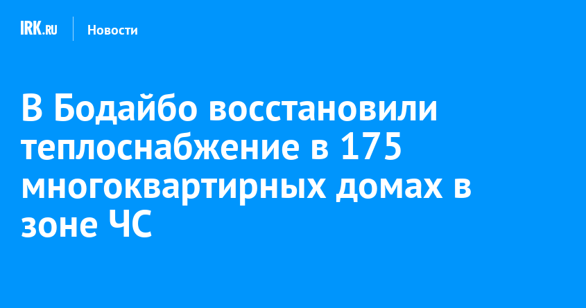 Утром 20 февраля в Бодайбо подключили к теплу все многоквартирные дома. Всего восстановили теплоснабжение в 175 жилых постройках: 56 многоквартирных, 69 домах блокированной застройки, 50 индивидуальных жилых строениях, сообщается в телеграм-канале администрации муниципалитета.