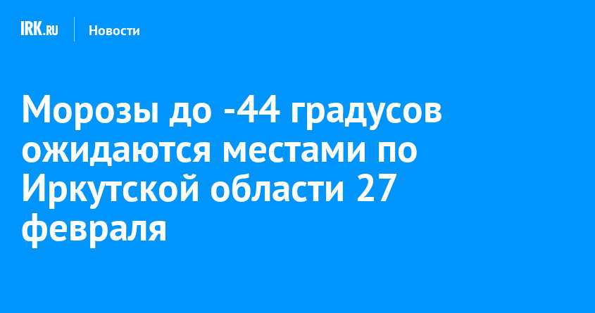 27 февраля в Иркутской области прогнозируют переменную облачность, местами пройдет небольшой снег. Ветер 4-9 метров в секунду. Ночью столбики термометров покажут -29…-34 градуса, при прояснении будет около -39…-44 градусов, днем ожидается -15…-20 градусов, в пониженных формах рельефа -25…-30 градусов, сообщили в Иркутском Гидрометцентре.