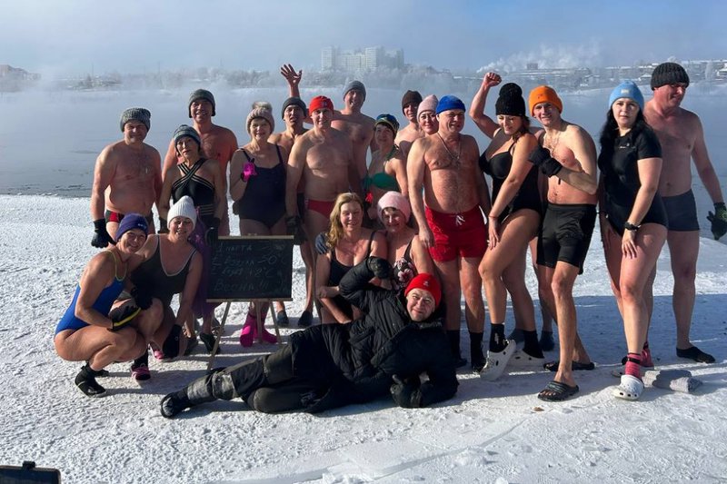 Десятки мужчин и женщин в ярких шапках и купальных костюмах устроили традиционный воскресный заплыв в Ангаре. В этот день температура воды в реке была всего два градуса. Момент также зафиксировали на памятной табличке.