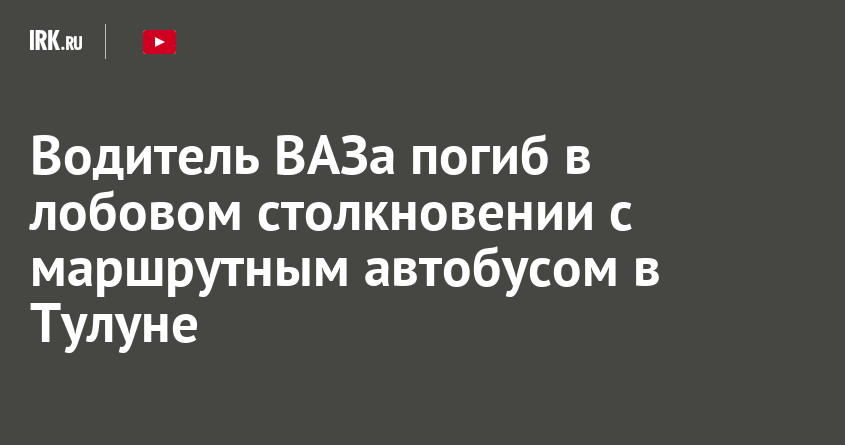 Вечером 12 марта на подъезде к микрорайону Железнодорожников в Тулуне произошло лобовое столкновение маршрутного автобуса ПАЗ и автомобиля ВАЗ-2109. В результате погиб водитель «девятки». Он скончался на месте до приезда бригады медиков, сообщили в Госавтоинспекции региона.