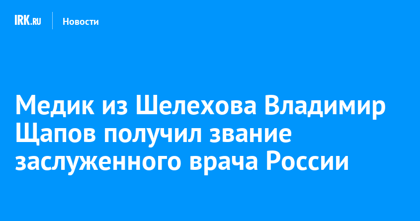 Заведующему хирургическим отделением Шелеховской районной больницы Владимиру Щапову присвоили звание «Заслуженный врач РФ». Соответствующий указ подписал президент России Владимир Путин. Кроме того, звания «Заслуженный работник здравоохранения РФ» удостоена заведующая фельдшерско-акушерским пунктом поселка Быково Аларской районной больницы Татьяна Хоботова.