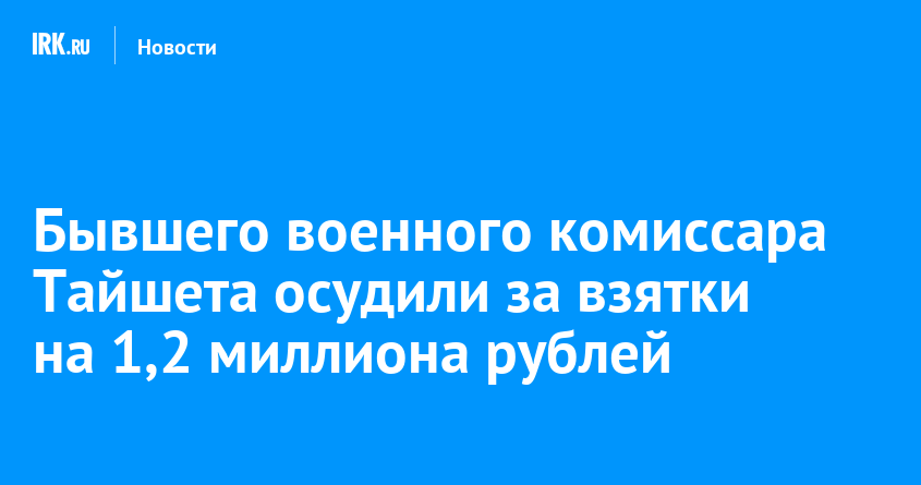 Тайшетский городской суд вынес приговор бывшему военному комиссару Тайшета, Тайшетского и Чунского районов. Его признали виновным в получении взяток, служебном подлоге и превышении должностных полномочии. Мужчине назначили семь лет лишения свободы в колонии строгого режима со штрафом в четыре миллиона рублей, сообщили в объединенной пресс-службе судов общей юрисдикции Иркутской области.