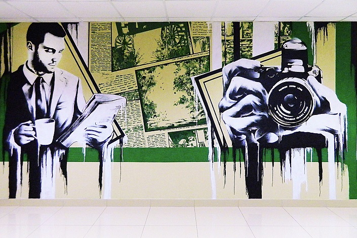 Работа, которой я действительно горжусь, – это колонна в читальном зале журналов и газет. Это исключительно декорация, тематика вырезок из отечественных и иркутских журналов и газет. На этой стене в полной мере ощущаешь все качества фактурной штукатурки.