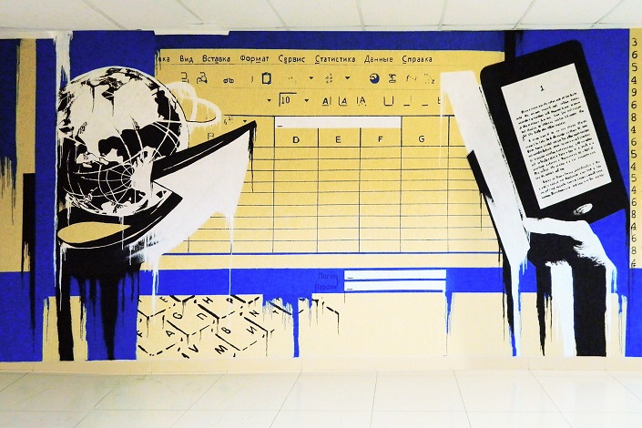 Этой зимой у меня случился небольшой прорыв. Ранее максимальный размер работ достигал 40 квадратных метров, а в этот раз удалось попробовать себя на больших масштабах в библиотеке имени Молчанова–Сибирского. По техзаданию, нужно было расписать 205 «квадратов» за месяц. Основная проблема состояла в том, что покрытие стен в «Молчановке» — фактурная штукатурка. То есть, поверхность так просто не прокрашивается, даже аэрозолем, даже с первого раза.