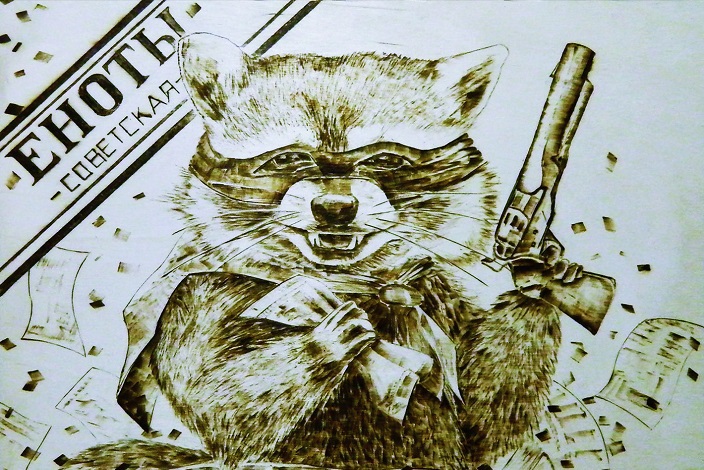 В тоже время много работаю и в других техниках, и в каждой из них есть свои особенности. Одно время нравилась графика из–за вариаций заливок, монохрома. Затем любимыми стали акрил, масляная живопись — от этого материала я просто в восторге. На данный момент мне очень интересна пирография (старое–доброе выжигание по дереву) — интересно воплощать современные сюжеты в такой немного забытой технике. При этом у тебя нет права на ошибку — сильно прожег материал, и работу уже не исправишь.