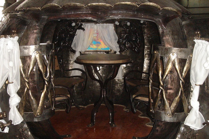 Вторая наша масштабная работа — карета-тыква диаметром около трех метров и массой в 2,5 тонны. В ней свободно могут поместиться шесть человек, кроме того, конструкция мобильная и может передвигаться. С этой работой мы принимали участие в выставках, в том числе в Иркутске и Тальцах. Карета создавалась больше года и над ней работали 12 мастеров.