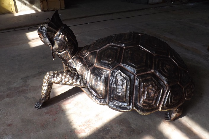 Любая наша работа начинается с эскиза, его разработка тоже может занять немало времени. После этого мастер подбирает необходимые материалы и переходит к воплощению замысла. При этом могут использоваться разные техники и приспособления, а их количество можно сравнить с «арсеналом» стоматолога или ювелира, только у нас масштаб, конечно, побольше. По завершении работы изделие покрывается слоем латуни или меди, чтобы выделить некоторые части, также может применяться воронение. В конечном итоге все покрывается автомобильным лаком. В таком виде изделия могут прослужить многие годы, кроме того, они, можно так сказать, антивандальные. К сожалению, находятся такие, кто пытается что-нибудь «открутить».