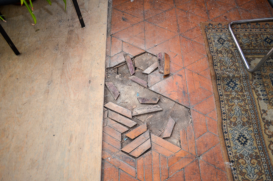 Своих гостей Бревновы встречали в буфетной. В просторном холле стоял буфет с закусками, горячительными и прохладительными напитками. Удивительно, что здесь и в гостиной сохранился паркет того времени. Он по-настоящему уникальный — состоит из 18 сортов южно-африканских деревьев. Как рассказал Юрий Баранов, после обследования здания, когда были вскрыты полы, оказалось, что паркетная плитка имеет на обратной стороне клеймо. На дереве выжжено: «Фабрика паркетных изделий купца Кенига». Своеобразный знак качества паркета, которому исполнилось более ста лет.