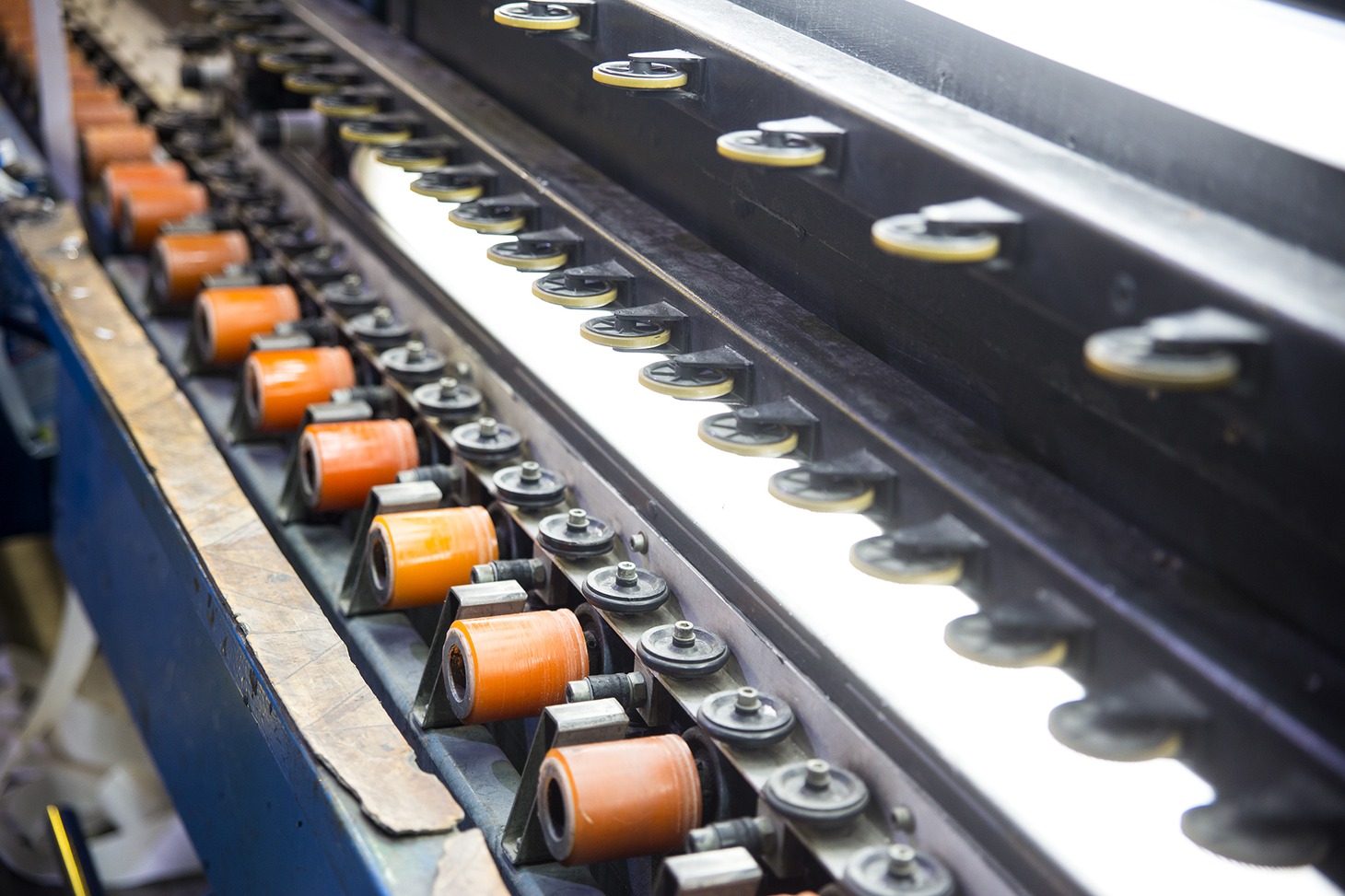 Станок регулируют под размер детали. Листы стекла ползут внутрь машины, где происходит механическая обработка. Затем деталь выкатывается на ролики и идет другой стороной, позволяя отшлифовать две другие. Процесс автоматизирован, для работы достаточно одного оператора. Здесь постоянно слышен шум воды, она остужает абразивные элементы — особо прочные камни, обрабатывающие кромки.