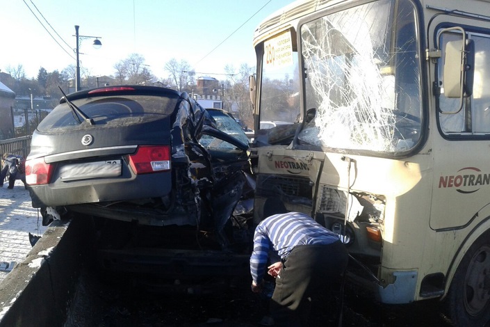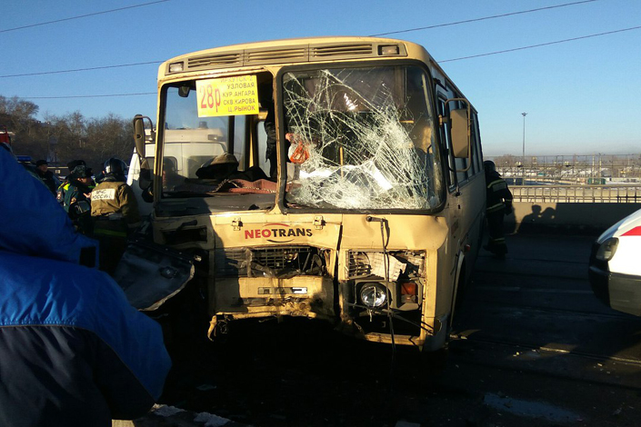 На Глазковском мосту в Иркутске столкнулись автобус, следовавший по маршруту №28, и автомобиль SsangYong Kyron. Водитель иномарки не справился с управлением.