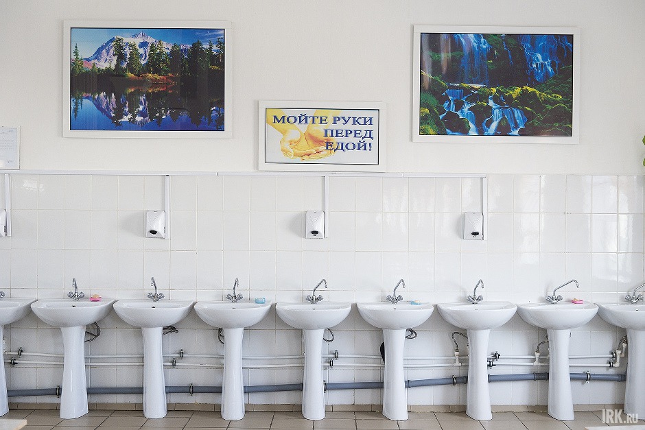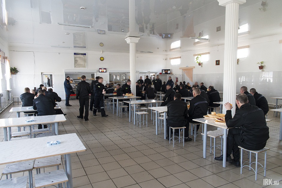 Нам показали столовую, она не отличается от школьной: такие же умывальники, ряды столов со стульями, в конце зала раздача. Готовят здесь тоже заключенные. На обед дается от 45 минут до полутора часов, в зависимости от того, как далеко находится производство.