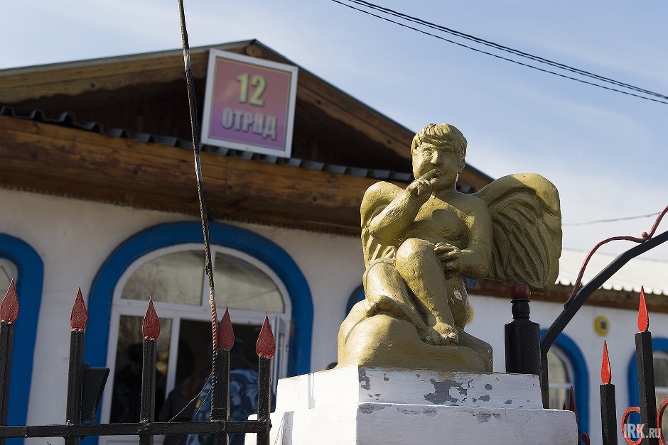 Когда открылась дверь во двор учреждения, перед нами предстала ухоженная площадь, обставленная вырезанными из дерева фигурами, за ними — клетка с настоящим медведем.