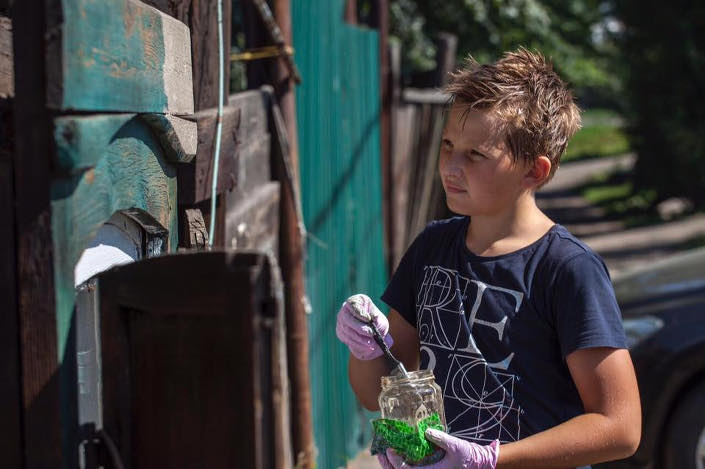 Субботним утром команда волонтеров начала приводить в порядок дом № 13 на улице Горной. Здание, почти полностью скрытое за ветвями старых тополей, имеет уникальное убранство. Такой рисунок наличников — единственный в своем роде — больше нигде в Иркутске не встретишь. На верхней части наличника, которая называется кокошник, вместо традиционной резьбы оригинальный рисунок из деревянных ромбов. Кто-то назвал этот сюжет рыцарским, кто-то —убранством шахматной королевы. После облачения в серо-белую гамму фасад заиграл новыми красками.