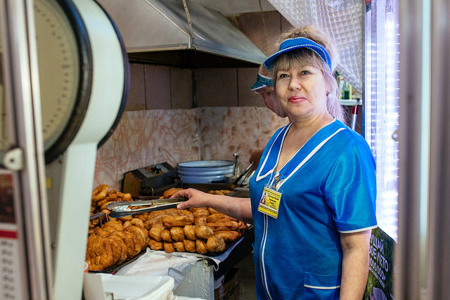 Для уличной торговли продавцы берут определенные весы. Тем, кто взял их в аренду на день, утром выдают те же самые. Перед началом рабочего дня продавцы получают фартуки и нарукавники. Сотрудник весовой вносит в журналы учета, кому и что выдает. Вечером сотрудники сдают вещи в стирку. Им не нужно нести фартук домой, чтобы постирать его.