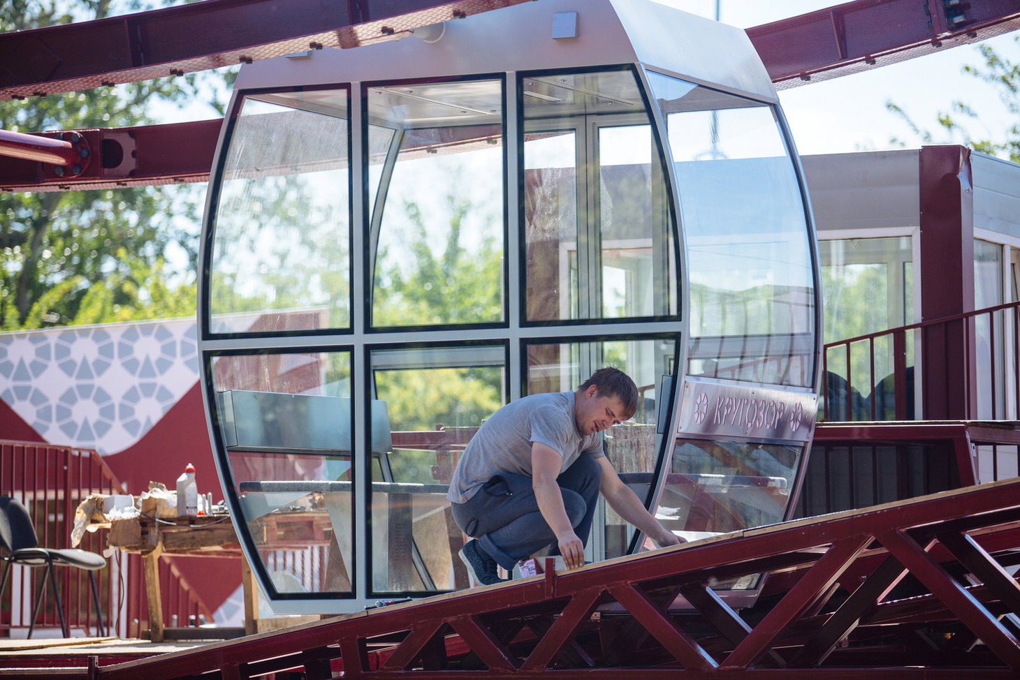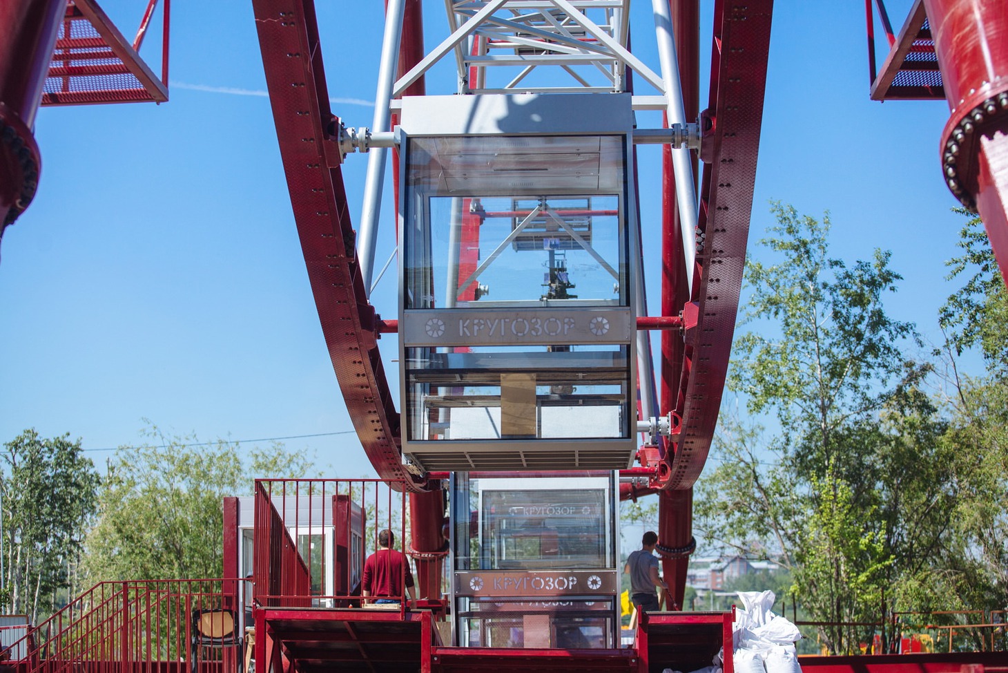 Всего на колесе размещается 24 кабинки (на предыдущем объекте в ЦПКиО их было 20, они были открытыми и располагались ближе друг к другу). Аттракцион уже испытали на прочность: 4 и 5 июня он работал при полной эксплуатационной загрузке.