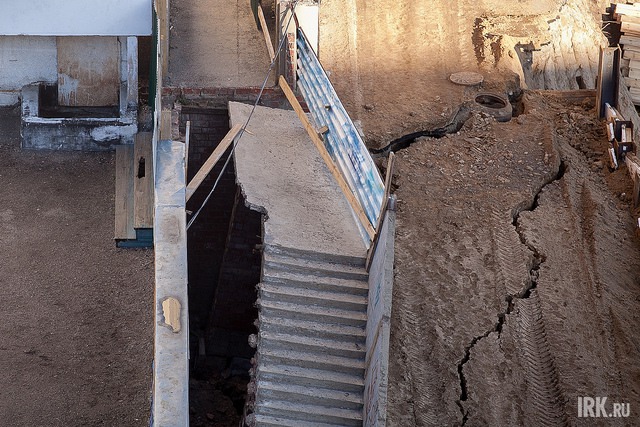 В субботу около 15 часов с журналистом IRK.ru связался житель одного из соседних со стройкой домов и рассказал, что услышал громкий хлопок и выглянул в окно. Из-под земли на месте стройки бил фонтан, котлован начал заполняться водой. В итоге обрушилась дорога по улице 3-й Железнодорожной, а от стены жилого дома, находящегося рядом со стройплощадкой, отошла бетонная лестница.