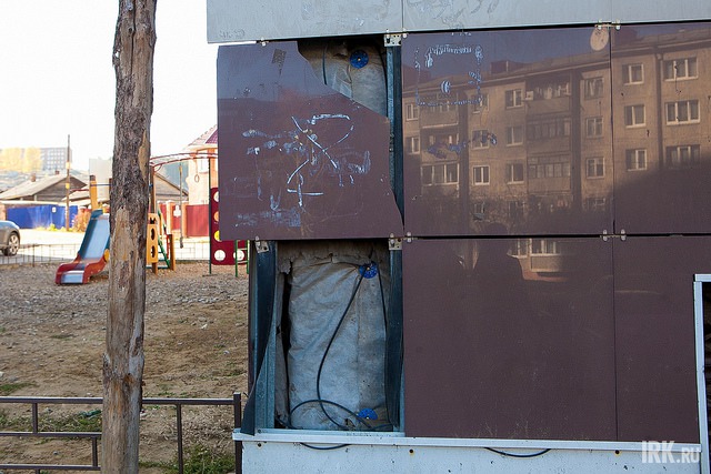 Рядом с «Калининским» небольшая детская площадка, которая относится уже к другому дому — тоже новостройке. На площадке, отсыпанной гравием, стоит детская горка и турник (правильно, нечего детей баловать). Огорожена, но нет съездов. Площадка вплотную примыкает к торцу здания, у которого нет нескольких фасадных плиток: судя по всему, их выломали. Торчат утеплитель, арматура и провода. Мало того, что это пожароопасно, так и небезопасно для играющих детей.