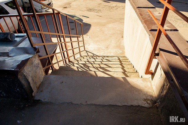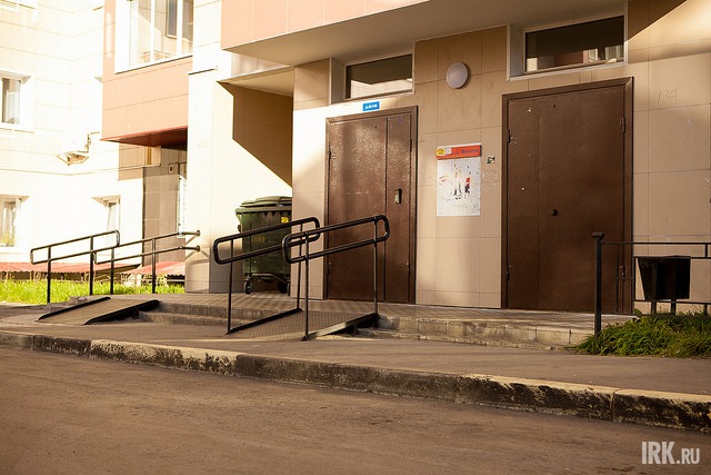Тут же, вплотную к платформе, с которой забирают мусорные контейнеры, установлен пандус. Перил нет. На инвалидном кресле подняться здесь невозможно. Хотя ради справедливости надо сказать, что и коляску закатить сложно, несмотря на наличие ступенек. А все из-за того, что ширина пандуса рассчитана только на ширину колес прогулочной коляски, а не трости, как у меня. Да, и пока я пыталась заехать наверх, старалась не дышать. Запах на крыльце возле мусорной платформы стоял невыносимый.