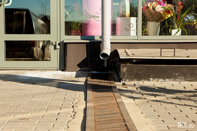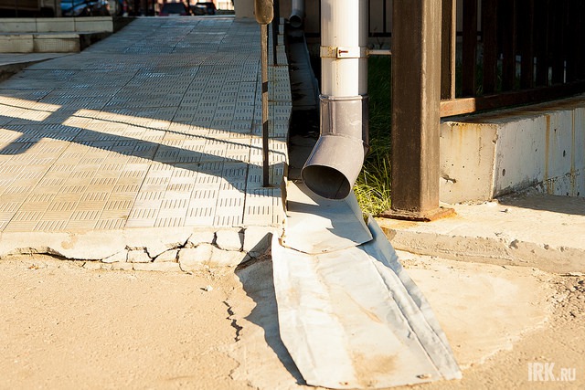 Внешние водостоки с крыши дома выведены прямо на тротуар. В результате вода разрушила асфальт, о чем свидетельствует свежая «заплатка». Опасно это тем, что вода поступает в грунт основания фундамента и разрушает его. В некоторых местах трубы выведены на газон. Но и тут нарушение: они находятся слишком высоко от земли.