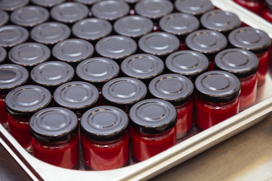 Протёртую ягоду разливают фасовочной машиной. В установке находится дозатор, который отмеряет от 10 до 100 граммов. Сейчас ягодное пюре разливают в стеклянные баночки по 35 граммов и в пластиковые ведерки по килограмму.