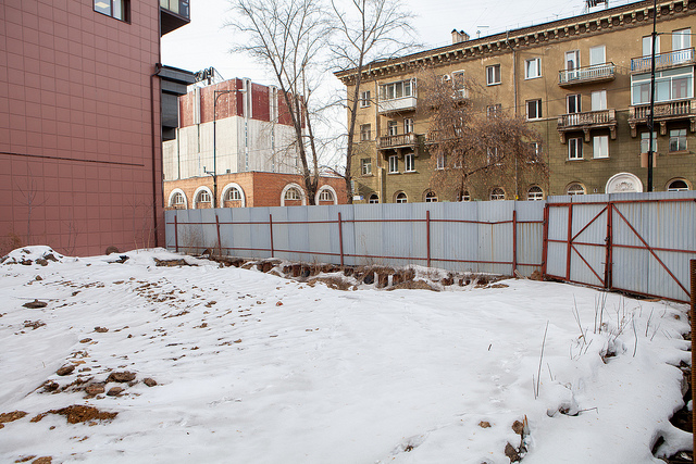 Согласно информационному стенду, на улице Горького строят семиэтажную гостиницу с подземной парковкой. Место работ огорожено. За три года застройщик только и смог вбить столбы по периметру. Большего ему не дали сделать местные жители.