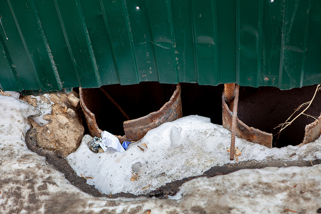 Однако на этом их неприятности не закончились. Сейчас люди боятся, что дом не выдержит. Мария показывает осыпавшуюся штукатурку на фасаде дома, трещину на асфальте, где проходит теплотрасса, — все это, утверждает женщина, последствия установки столбов. Она опасается, что если компания продолжит работы, подвал их дома может затопить. Все дело в грунтовых водах.