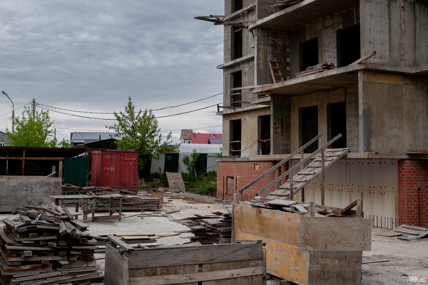 Заброшенный недострой в пять этажей — это все, что досталось от застройщика людям, купившим квартиры в доме на улице Радищева, 153/2. Стройка обнесена забором. На воротах — замок и большой выцветший баннер с рекламой ЖК. Стройплощадка просматривается хорошо: лежит строительный мусор, валяются провода, торчат куски арматуры и старые доски.