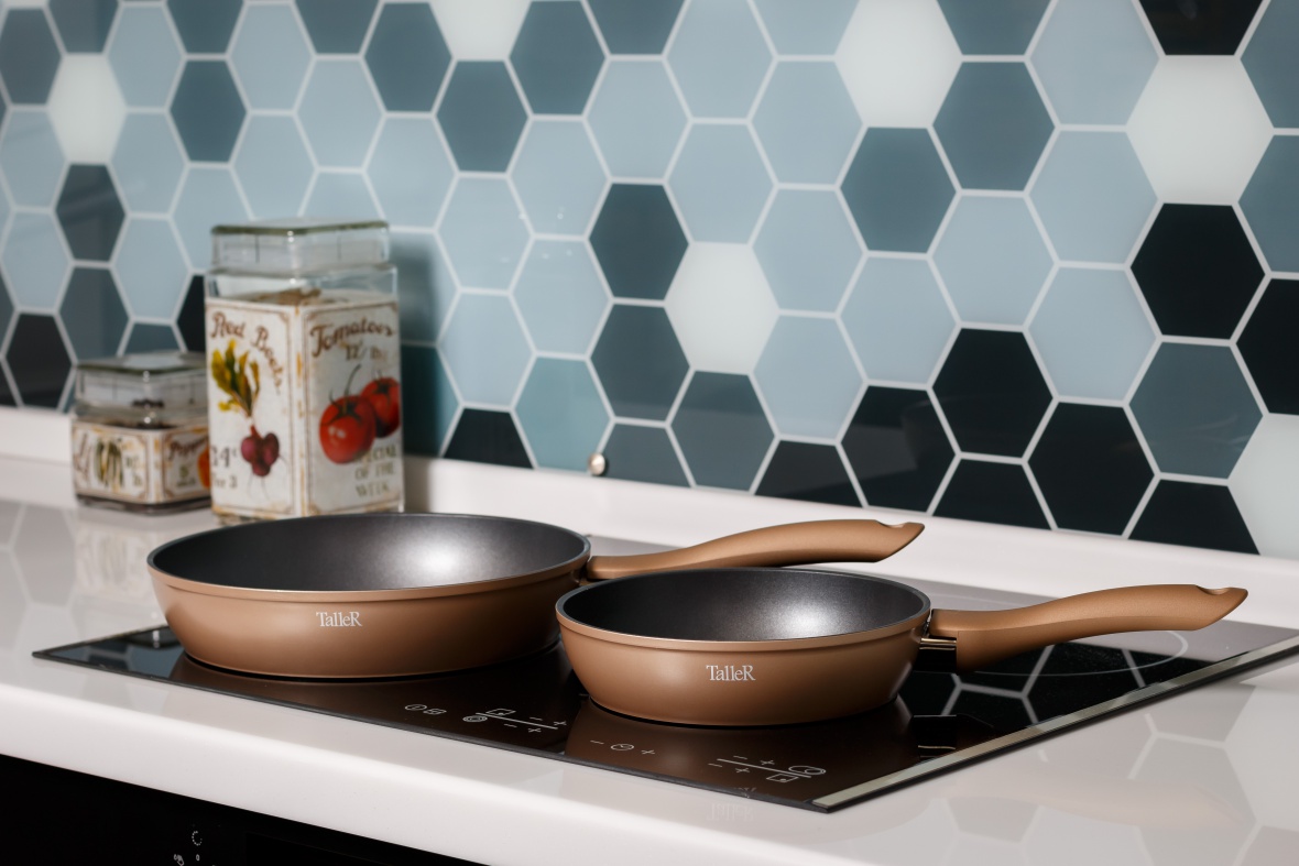 Материал сковороды тоже, поэтому нужно обращать внимание на материал при покупке. Например, алюминиевые сковороды легкие, быстро нагреваются, а антипригарное покрытие позволяет готовить с минимальным использованием масла или совсем без него. Современные алюминиевые сковороды с антипригарным покрытием не только можно мыть в посудомоечной машине, но и использовать на всех типах плит, в том числе и на индукционной.