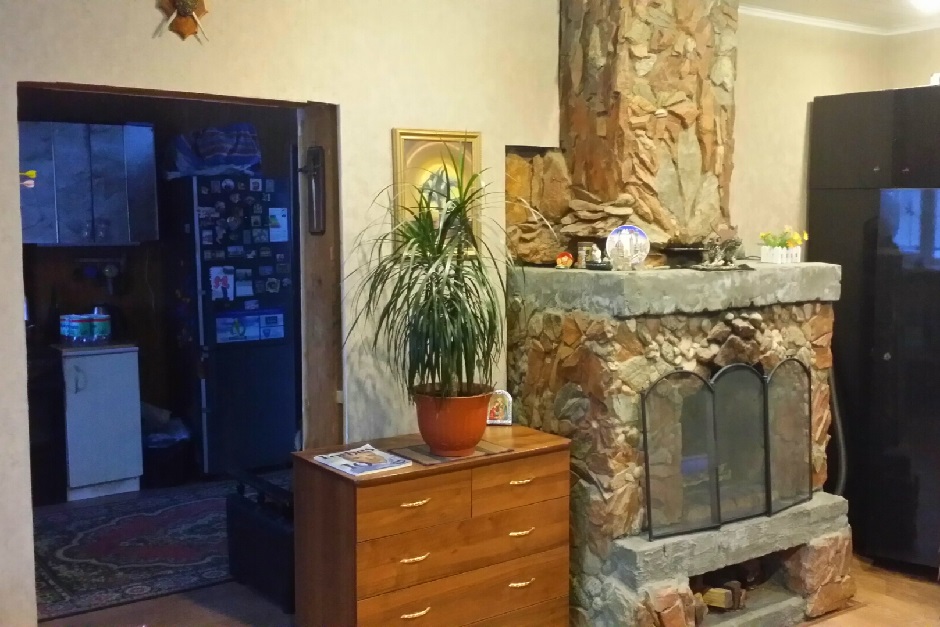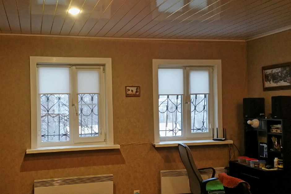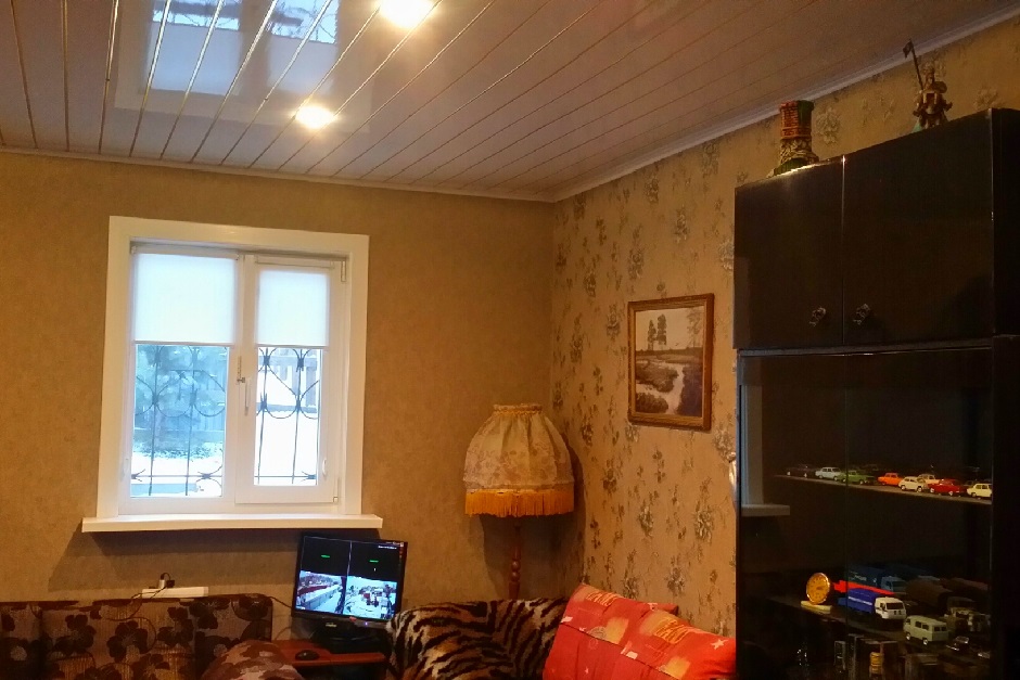 Дом получился теплый, на капитальном фундаменте. Внутри две комнаты, 25 и 18 метров каждая. Вставили двери и окна. Сделали теплые полы с электроподогревом, сверху положили линолеум. Стены обшивали гипсоволокнистым КНАУФ-суперлистом и потом клеили обои на них. Потолки — реечные подвесные со светильниками.