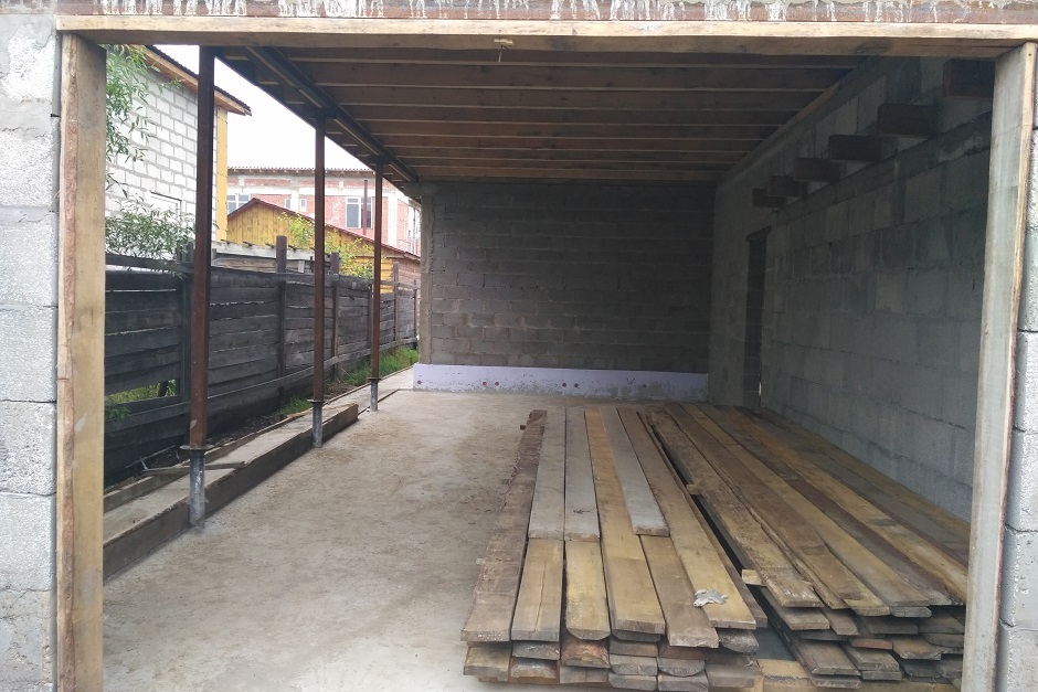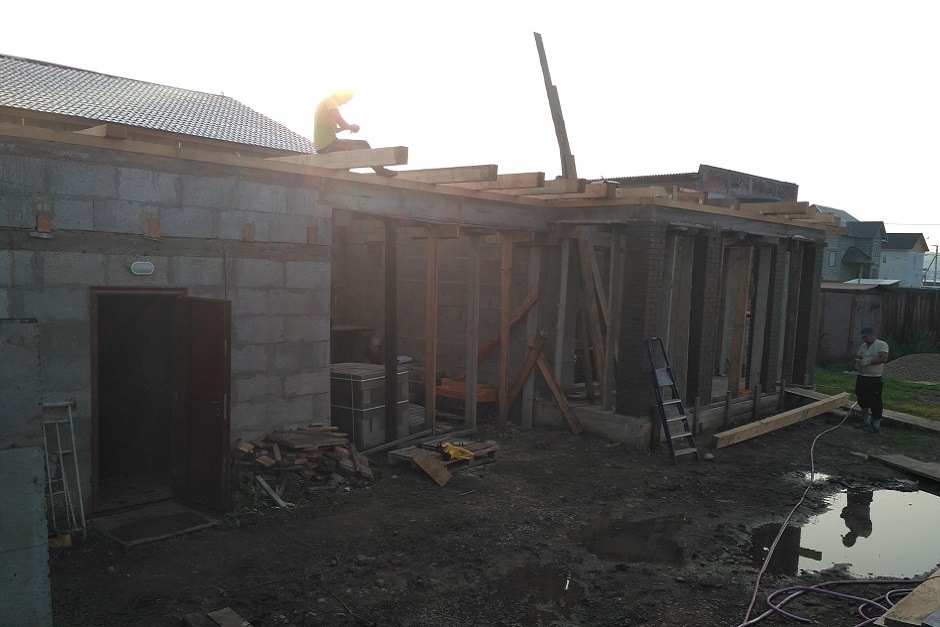 В середине июля мы возвели стены. Пришло время разбирать крышу со старого гаража, положить еще пару венцов полистиролбетонных блоков (старый гараж построил слишком низко), чтобы залить сейсмопояс в одной плоскости. Как вы уже догадались, вся постройка под одной крышей.
