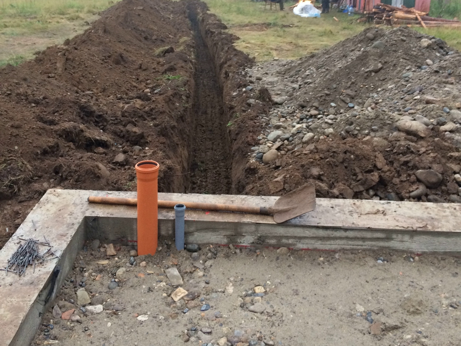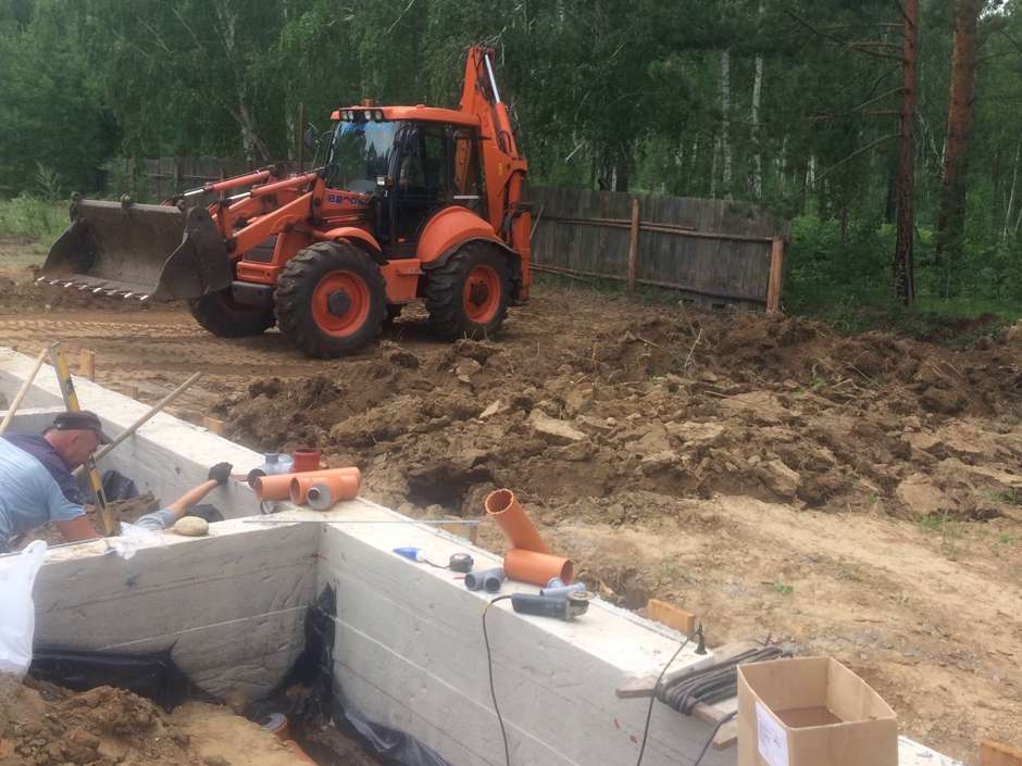 Параллельно с возведением дома были осуществлены земельные работы по планировке прилегающей территории, вынут грунт под канализационные кольца с траншеями к дому под водоотведение с глубиной траншей 3 метра, ниже отметки промерзания в нашей регионе (около 2,7 метра).