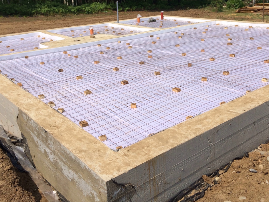 Перед утеплением фундаментной плиты были проведены внутренняя канализация и установлены гильзы под водоснабжение и электрификацию. Для утепления фундамента использовался «Пеноплекс» толщиной 5 сантиметров, по периметру была зафиксирована демпферная лента и сверху сетка. По окончании подготовительных работ произведена заливка фундаментной плиты толщиной 12 сантиметров из бетона М250 под теплые водяные полы.