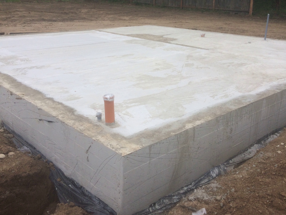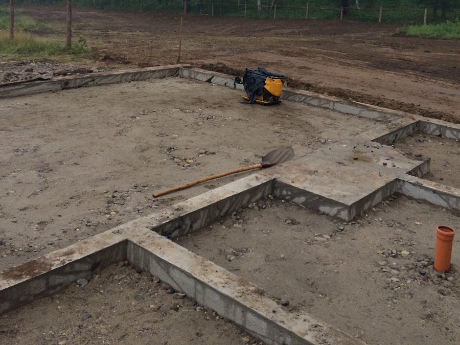 Бригадой строителей были выкопаны траншеи под фундамент, установлена опалубка и связан армирующий пояс для фундамента. Следующим этапом произвели заливку ленточного фундамента размерами 9х9 метров из бетона М250, по истечению недели была сделана обратная отсыпка, произведено уплотнение виброплитой каждые 30 сантиметров. Недостаточное уплотнение грунта может привести к разрушению строительной конструкции.