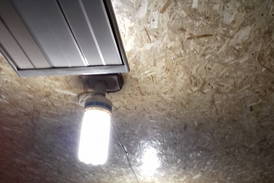 На зиму решил временно закрыть проемы — знакомые оконщики помогли с дверьми и окнами (сделали из некондиции даром), в проем ворот поставил пару листов сэндвича 32 миллиметра (тоже не новый) и подвесил один инфракрасный обогреватель 3 киловатта — в мороз минус 20, без потолка, внутри плюс 15 — стены держат тепло. Начал заниматься потолком.
