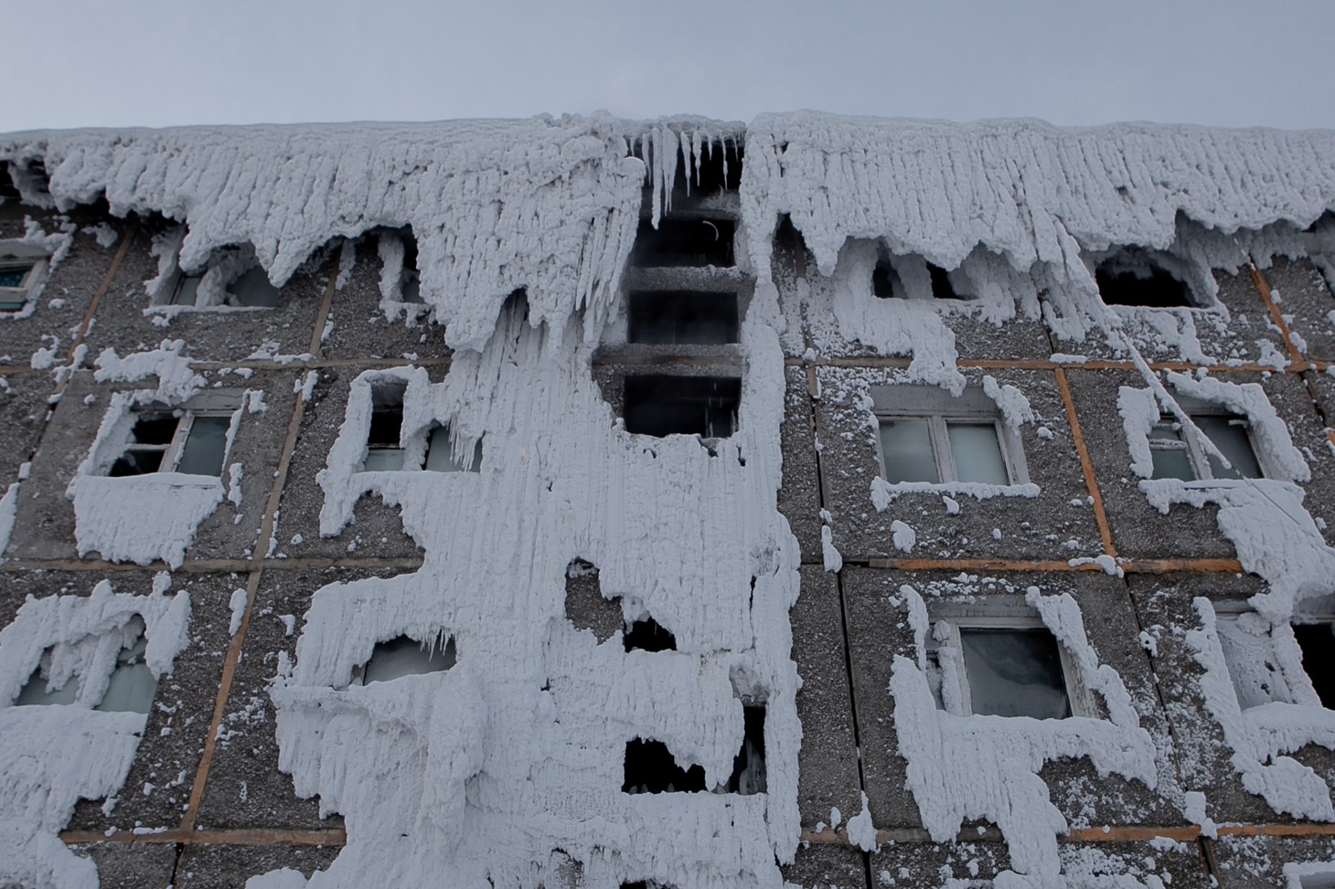 Одна часть пятиэтажного здания ветхая, с разбитыми стеклами в оконных проемах, другая похожа на ледяную пещеру. Створки щедро залепило снегом, массивная наледь свисает с крыши. Из окон с задней стороны постройки валит пар, в двух из них видно блекло-красное SOS.