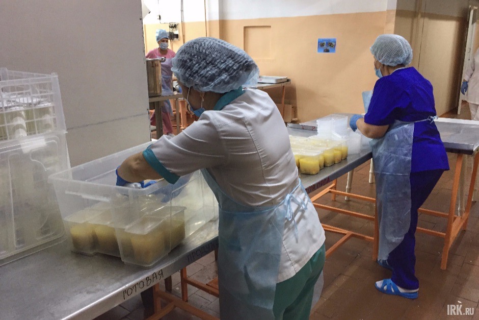 Вместе с Любовью Орестовной мы идем в пищеблок, где готовят еду для заболевших. Обязательно перед этим надеваю средства индивидуальной защиты: халат, шапочку, маску, перчатки и бахилы. Оглядываюсь вокруг. Пищеблок делится на две большие комнаты. В одной стоят плиты с большими металлическими котлами — здесь готовятся блюда.