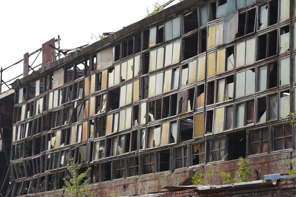 Едем по территории химпрома, она огромная — более 600 гектаров, периметр площадки около 20 километров. Все вокруг напоминает кадры из российского сериала «Чернобыль»: заброшенные здания, в прошлом — цеха, выбитые стекла, разбросанная арматура, открытые люки, трубы. Чтобы понять масштабы катастрофы, надо здесь побывать и увидеть все собственными глазами.