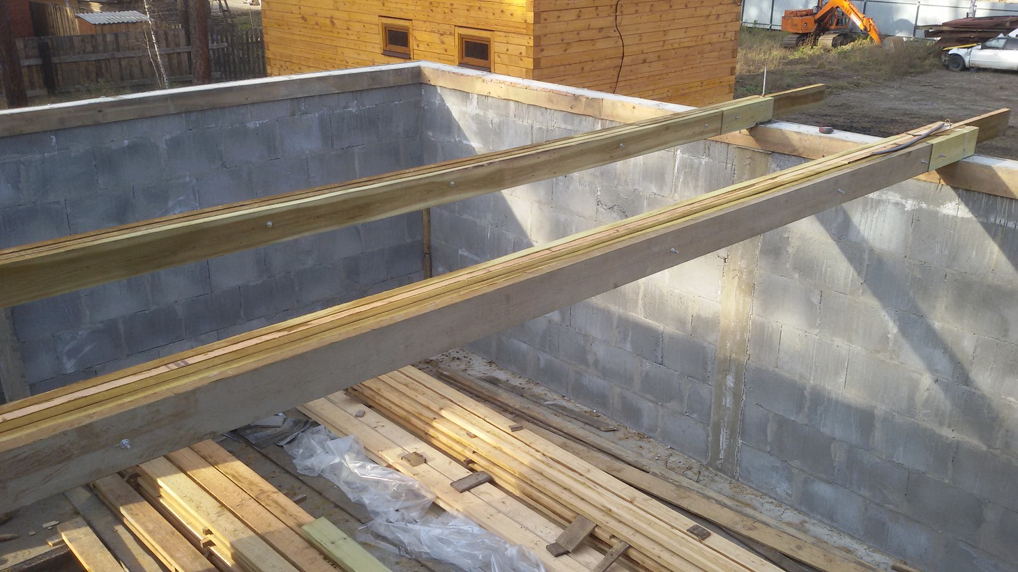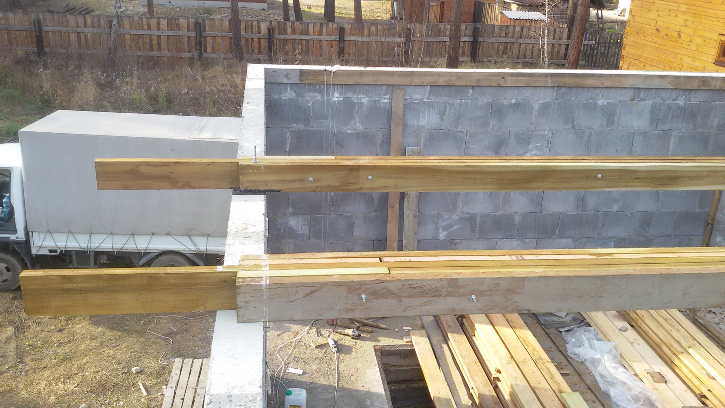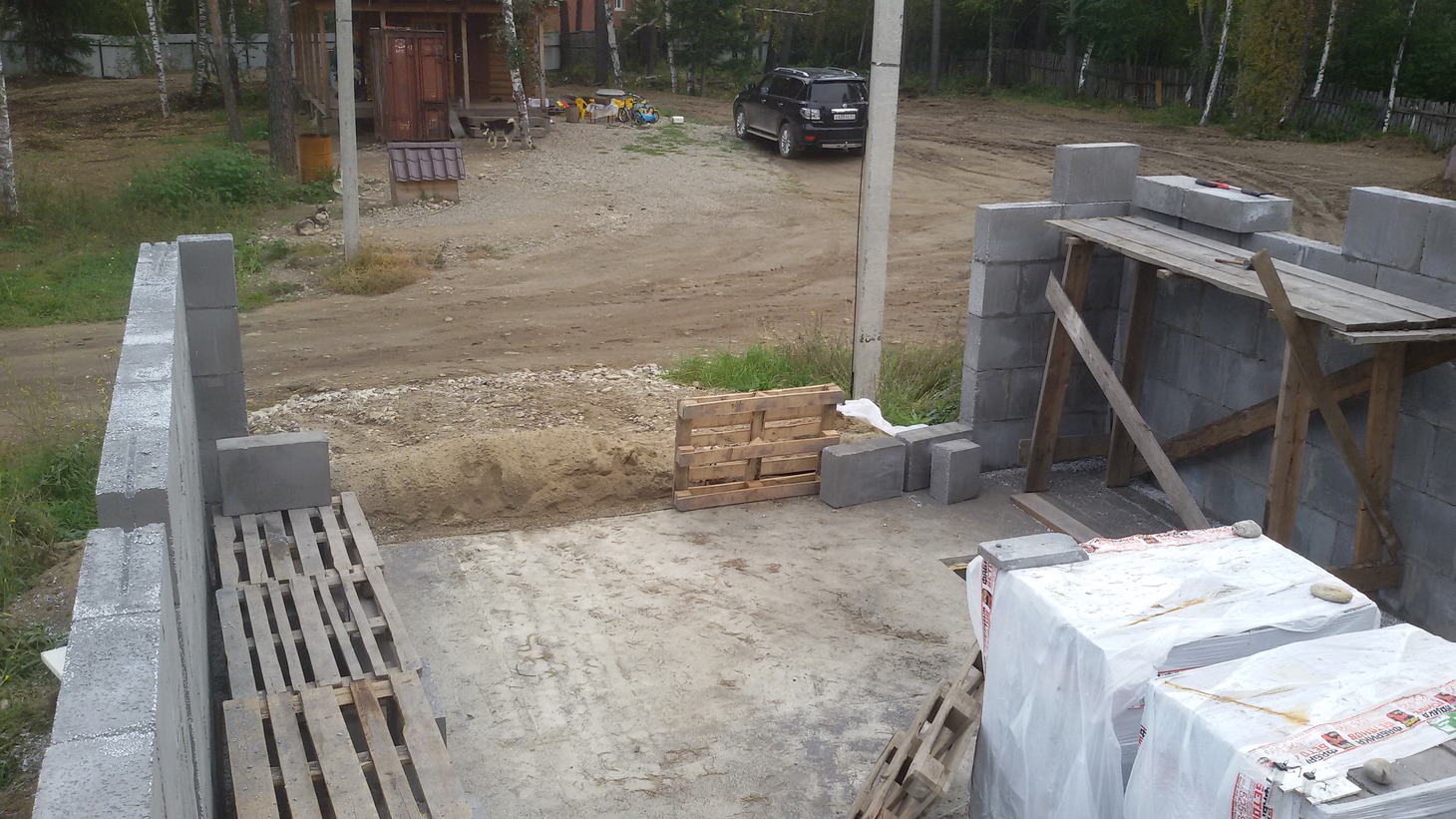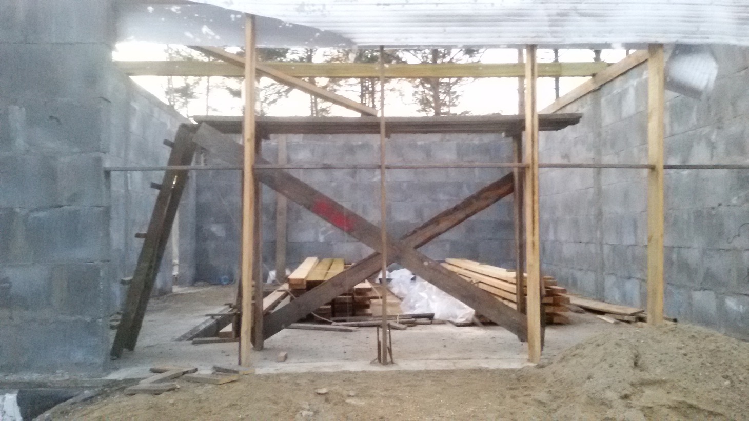 При возведении стен не приходилось усердно шлифовать поверхность после выкладки каждого ряда, так как геометрия материала вполне приемлемая. На армопояс также был заказан бетон — 6 часов передавания вёдер с раствором из рук в руки и опалубка заполнена!