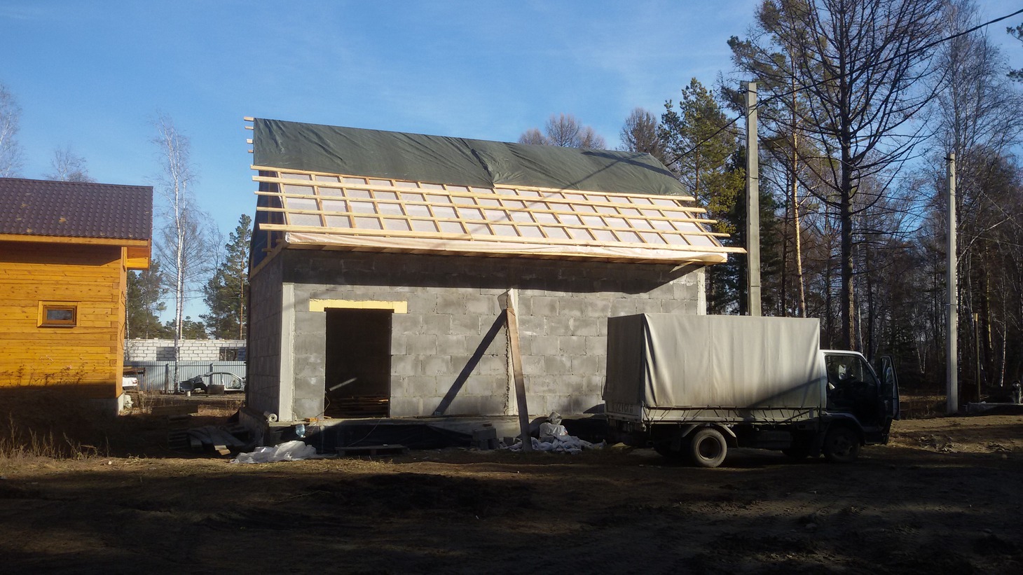 Крыша, ворота, двери — и гараж готов принять на хранение стройматериалы, а также беречь инструмент от граждан с пониженной социальной ответственностью. Гараж по размерам построили 7х9 метров. Специально делали большой, чтобы поместились две машины и еще осталось свободное пространство. Плюс в гараже есть второй этаж, он каркасный и утепленный. Не поверите, но зимой там можно практически жить, а вообще, конечно, он делался, чтобы там можно было что-то хранить.