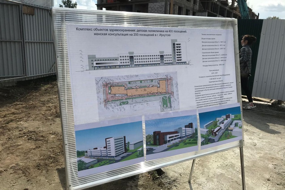 Следующим пунктом посещения стала строительная площадка медицинского комплекса ОГАУЗ «Медсанчасть ИАПО» во Втором Иркутске. Здесь возводятся детская поликлиника на 400 посещений в смену и женская консультация на 200 посещений.
