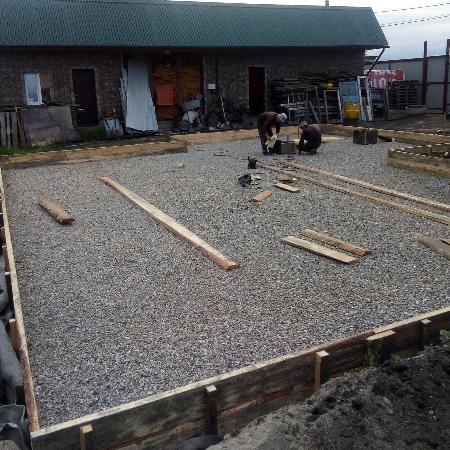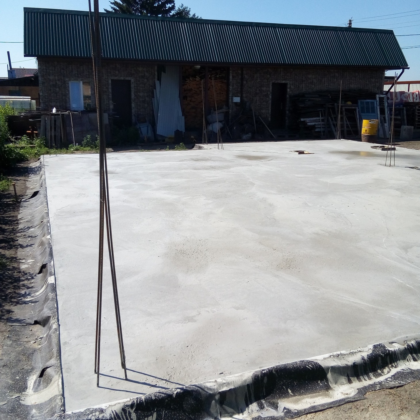 Сначала был подготовлен неглубокий котлован под подушку – 30 сантиметров песка и 20 сантиметров щебня, разделенные геотекстилем и поочередно утрамбованные виброплитой. Поверх подушки была проведена гидроизоляция, выставлена опалубка и связан армокаркас под плиту толщиной 35 сантиметров. Коммуникации были проложены в подушке и выведены внутрь будущего дома. Заливка плиты проведена бетоном М350, после чего плита выстаивалась 20 дней для приобретения прочности.