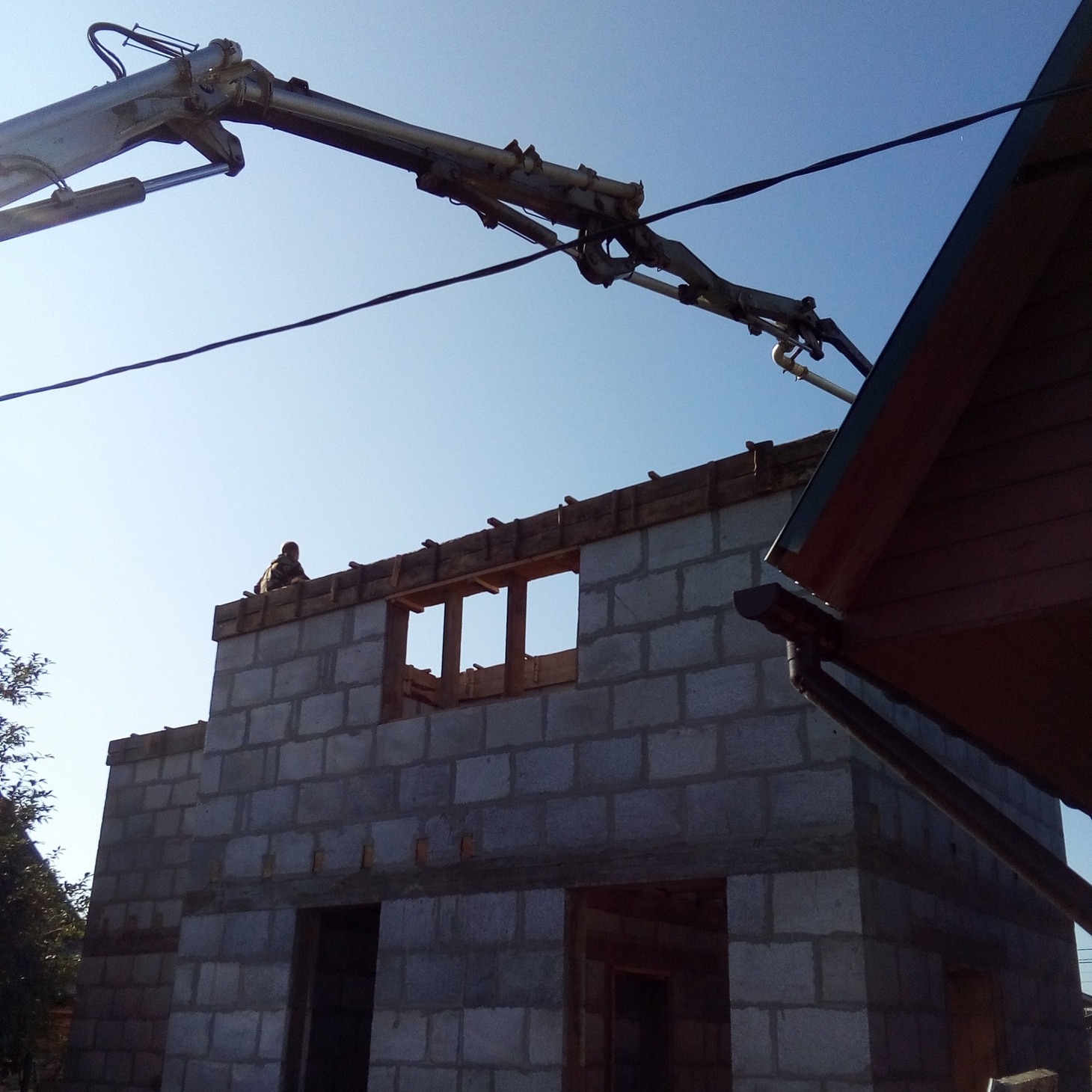 После набора прочности бетона плиты приступили к выкладке стен будущего дома – первый этаж был запланирован высотой 3,1 метра – 7 рядов полистиролбетонных блоков плюс 30 сантиметров – армопояс первого этажа. Второй этаж – на 40 сантиметров ниже – шесть рядов блоков плюс армопояс второго этажа. Для создания жесткого каркаса по углам здания при заливке армопоясов заливались колонны, арматура которых была связана с арматурой армопоясов и кладочной сеткой, которая укладывалась через 2 ряда блоков. Дополнительно бетонным раствором с армированием были залиты проемы дверей и окон по периметру. Блоки укладывались на клей FIXBLOK. Перекрытие первого и второго этажа произведено деревянным брусом 10х20 сантиметров, закрепленным на заранее вбетонированных в армопояса шпильках. Крыша двухскатная, покрыта профлистом. Зашиты и окрашены карнизы и фронтоны дома, проведено утепление здания снаружи в один слой минеральной ваты с дальнейшим закрытием её профлистом, смонтирована водосточная система.