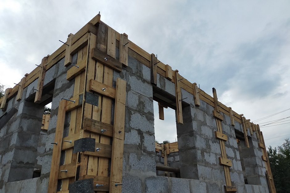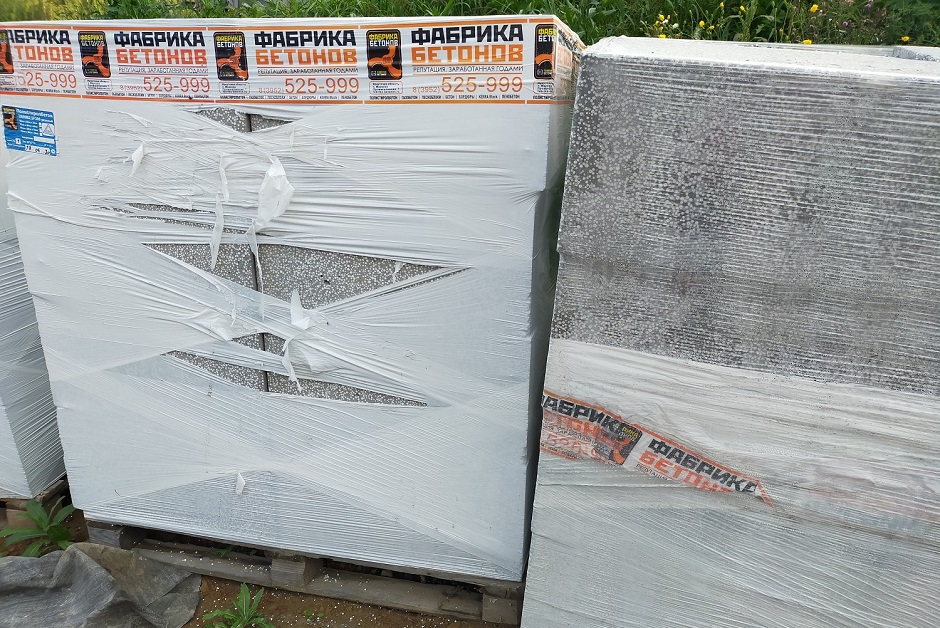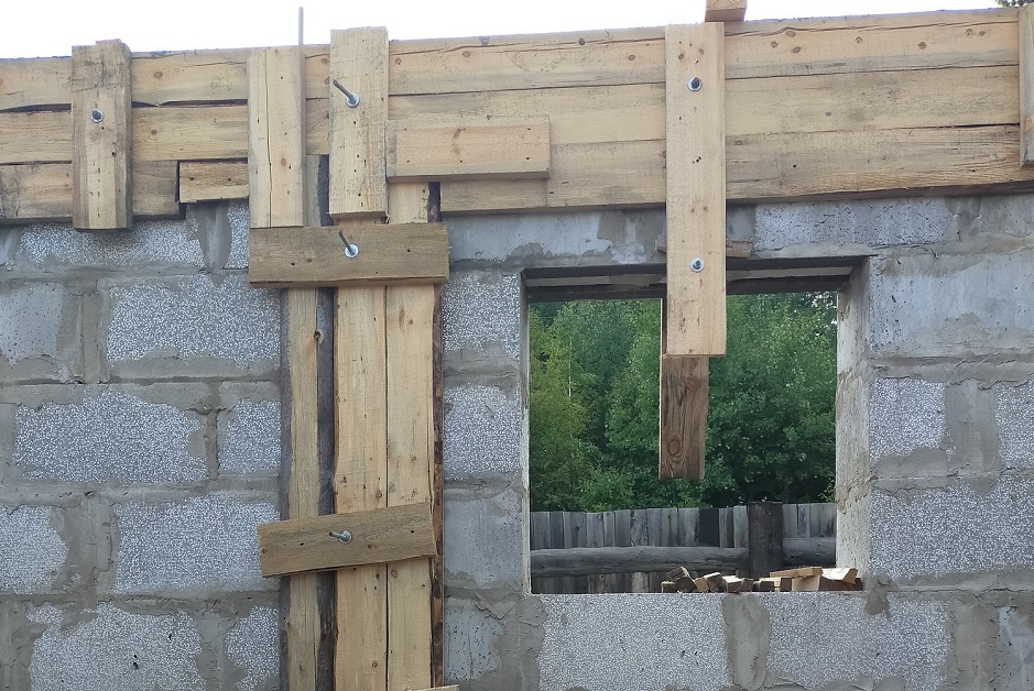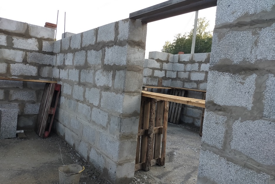 Этап 3: возведение стен. Строители защитили кладку от проникновения влаги из фундамента слоем гидроизоляции — рубероида. Стены из полистиролбетона толщиной 40 сантиметров выложили быстро. Материал легкий, теплый, прочный и не горит. При покупке блоков «Фабрика Бетонов» дала в подарок клей — его использовали с раствором цемента. Перемычки над окнами и дверями установили из стального уголка. «Проблемные зоны» армировали катанкой 8 миллиметров для избежания образования трещин.