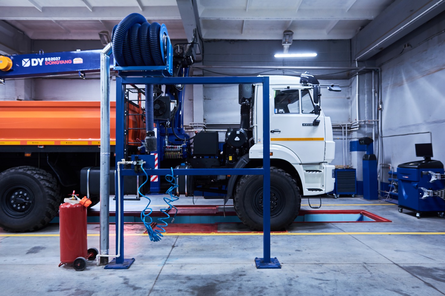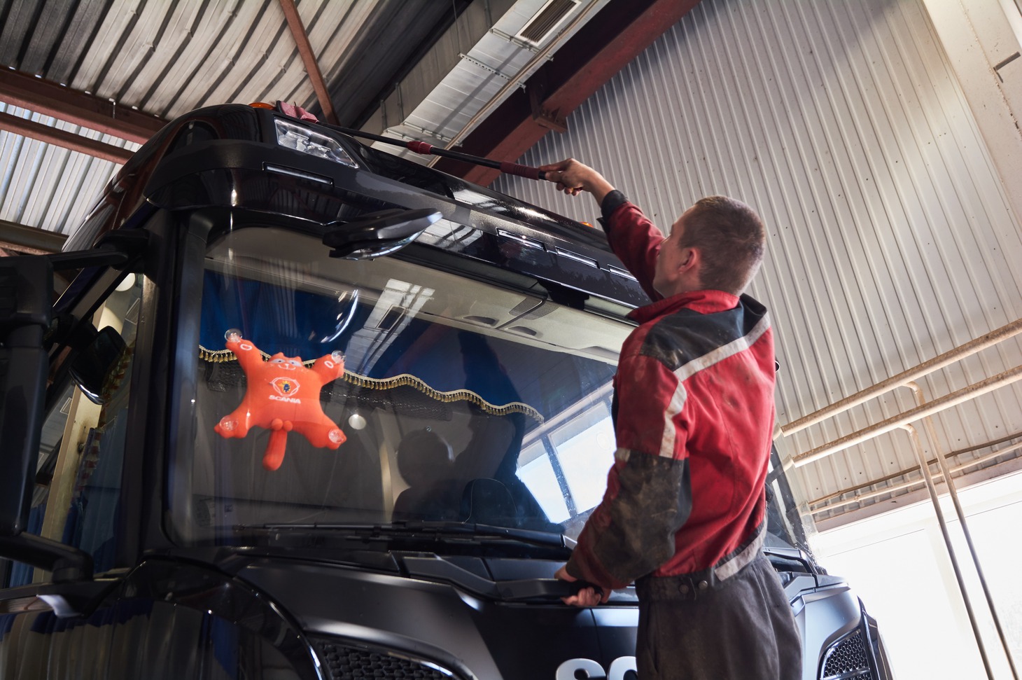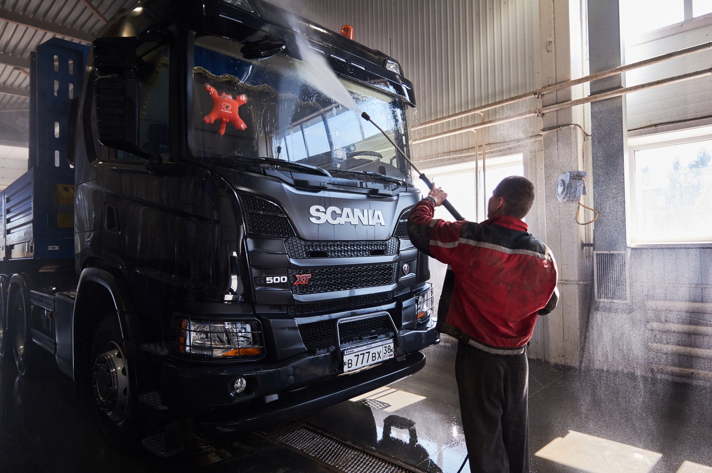 После оформления документов и приемки, автомобиль загоняют на мойку. Помещение моечного комплекса оборудовано тремя аппаратами Кёрхер с подогревом воды. Как говорят сотрудники, чистка горячей водой особенно эффективна зимой, когда большегрузы приезжают во льду и мазуте.