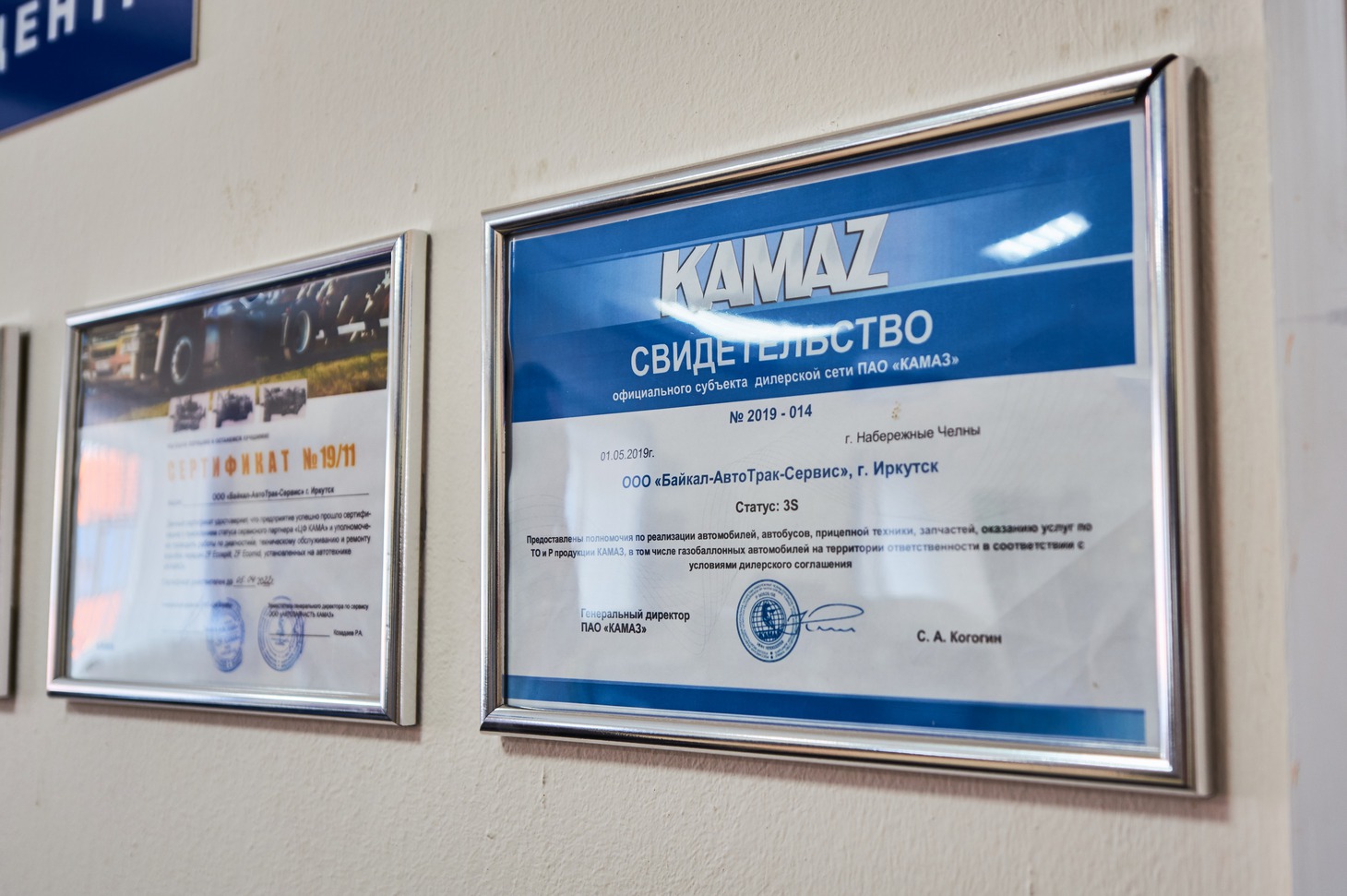 «Байкал-Камаз-Центр» имеет все необходимые сертификаты для работы с агрегатами и системами автомобилей КАМАЗ, например Сертификат по обслуживанию автомобилей магистрального семейства К5, сертификаты Daimler, Cummins, Wabco, ZF и другие. С полным списком сертификатов можно ознакомиться по ссылке.