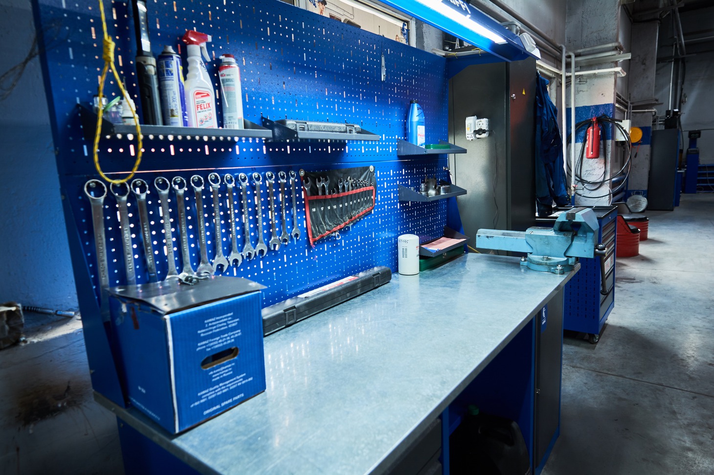 В здании напротив расположены посты технического обслуживания. Специалисты производят плановый техосмотр автомобиля в рамках гарантии. Выполняется замена масел, расходников, смазка и протяжка крепежа в соответствии с планом ТО.